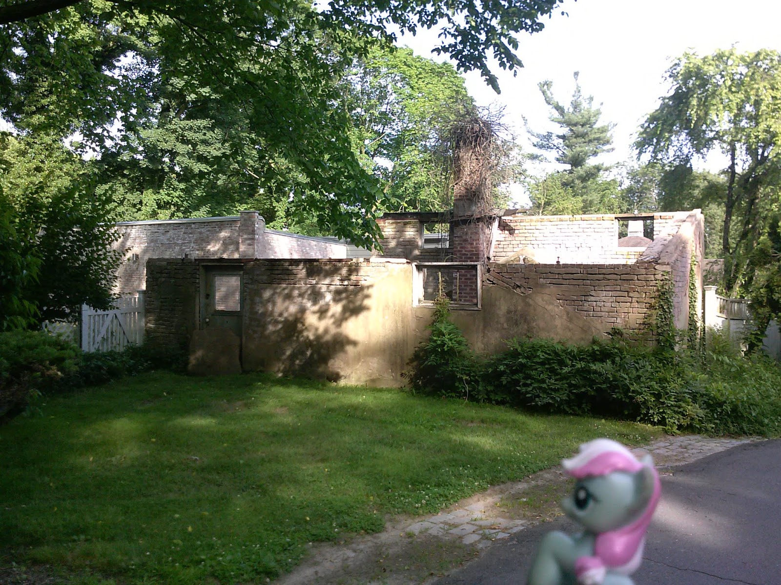 Near the park, but clearly in somepony's front yard, was a really old wrecked home with the brick parts still standing.
