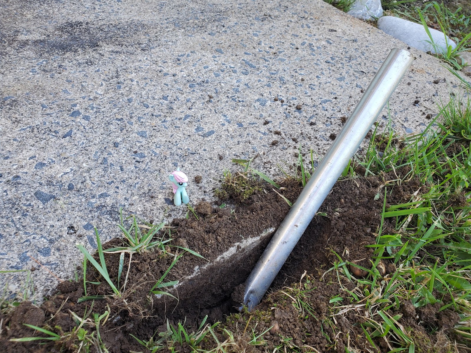 There was a nearby random metal pole that had been lurking in the bushes for a long time, come here and help us dig this hole a little deeper! Our non-garage setup failed to have a shovel, so we had to use this metal pole.