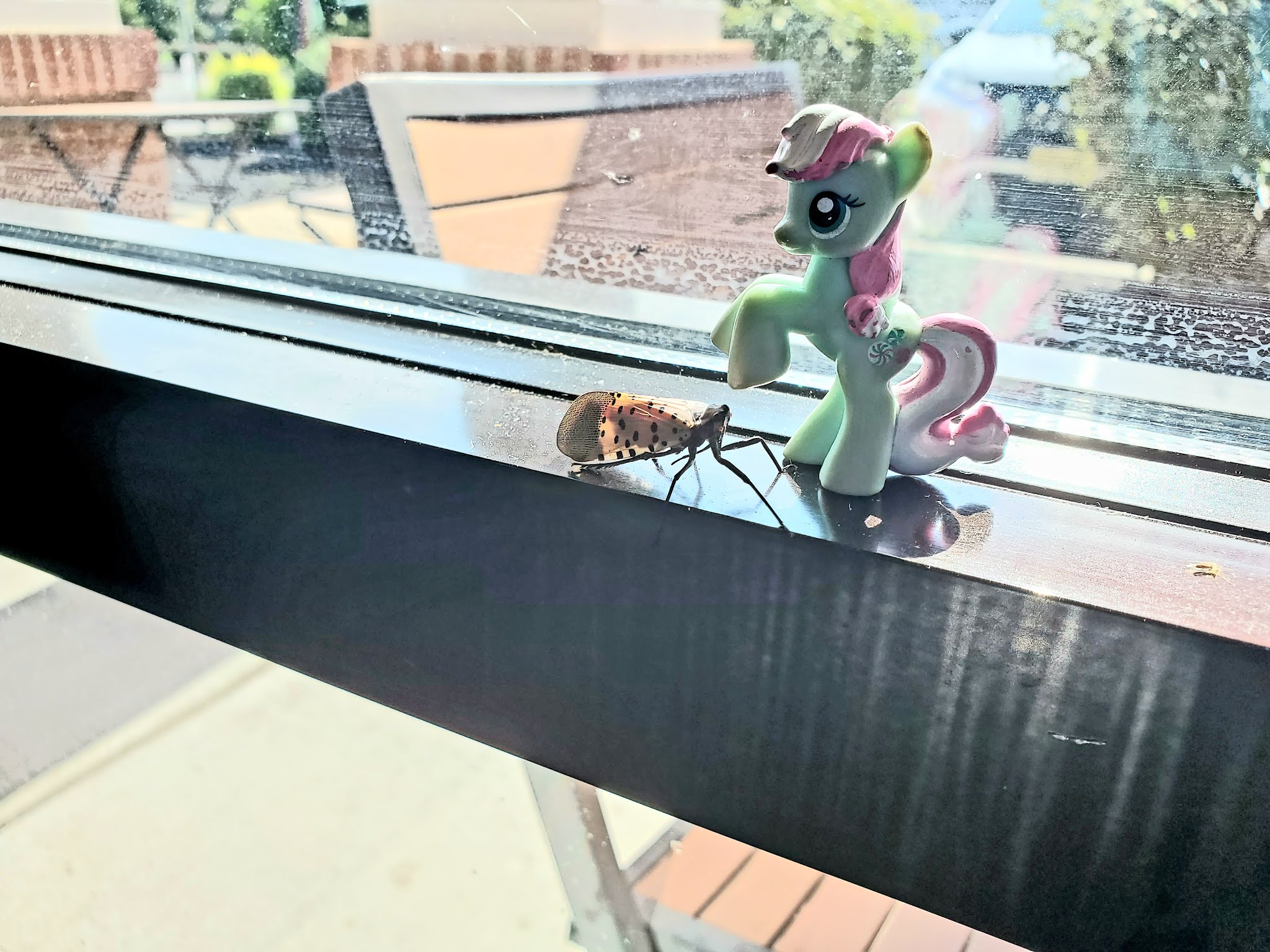 This spotted lantern fly snuck into the pizza place we go for lunch. I sat on the window to maybe get a picture of it crawling on me, but it carefully walked back and forth around me several times instead. The news reporters said we should squish as many of these as we can, since they are an ecological menace, but I always leave them alone.