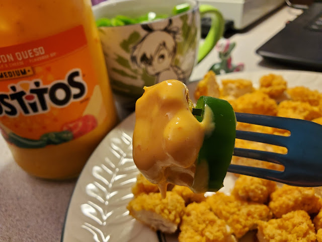 Once again explaining to a friend on the phone about our Nuggchos which is chopped up chicken pieces dipped in cheese with a jalapeno slice, and sent them this picture. I think maybe the chicken bits are better than regular nacho chips!