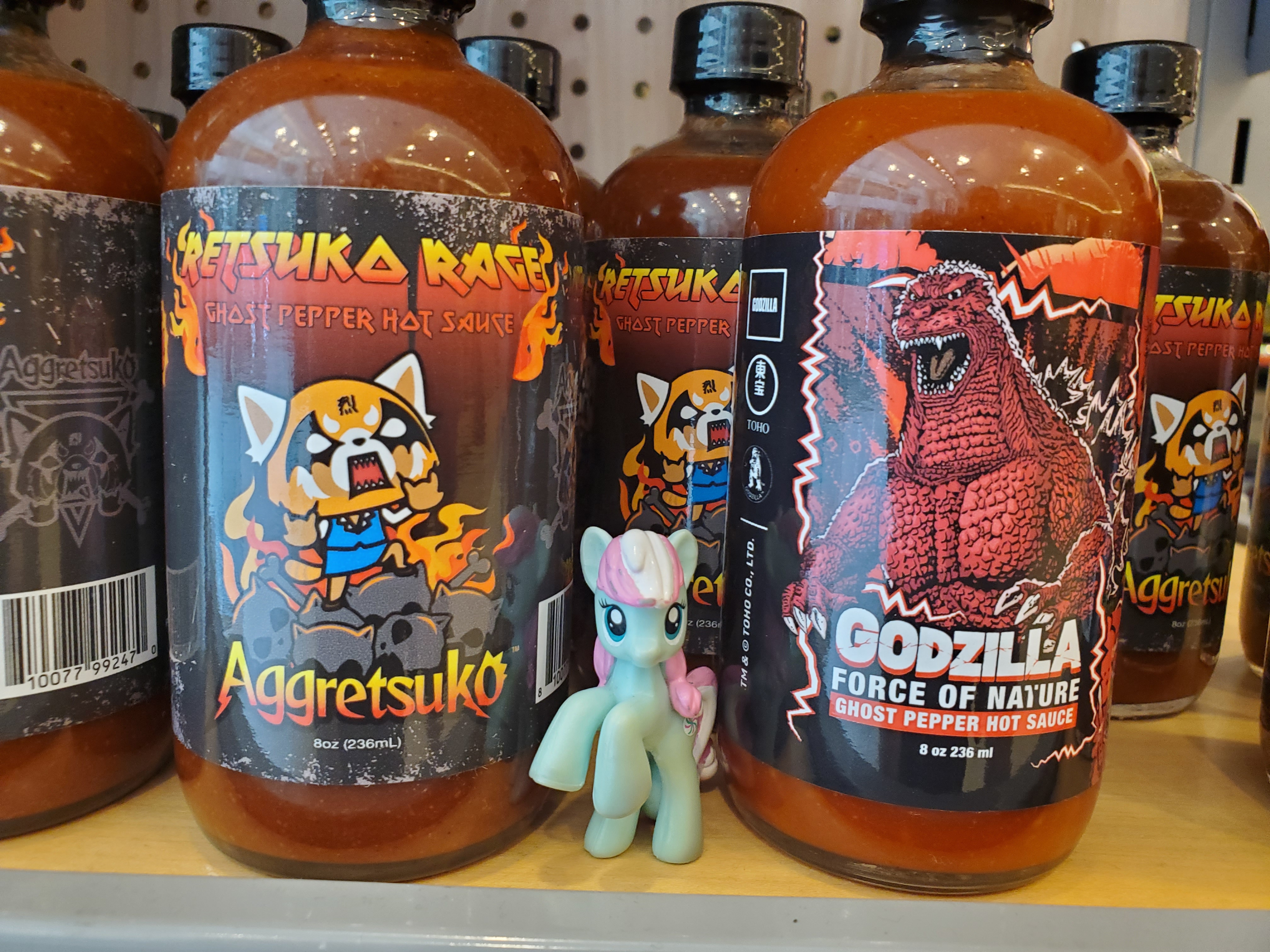 This looks like the same bottle of hot sauce but with two different labels on it. I knew Retsuko got some rage, but Godzilla-level rage? Also funny to think about Godzilla stomping around to death metal music, too.