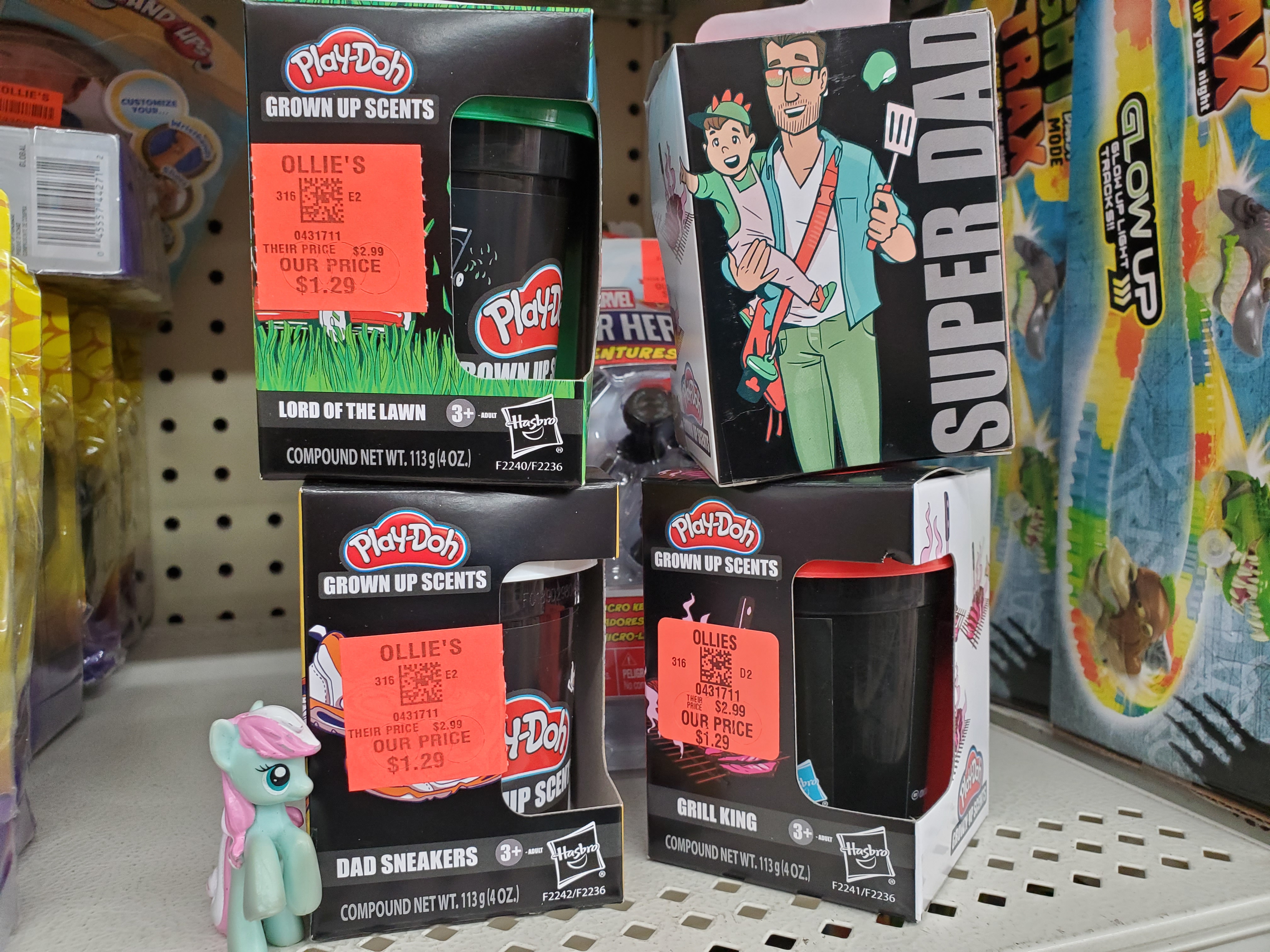 Smelling Play-Doh. Lawn, okay. Grill King, Um... okay. Dad Sneakers? GROSS! Does somebody at Play-Doh have a thing for feet?