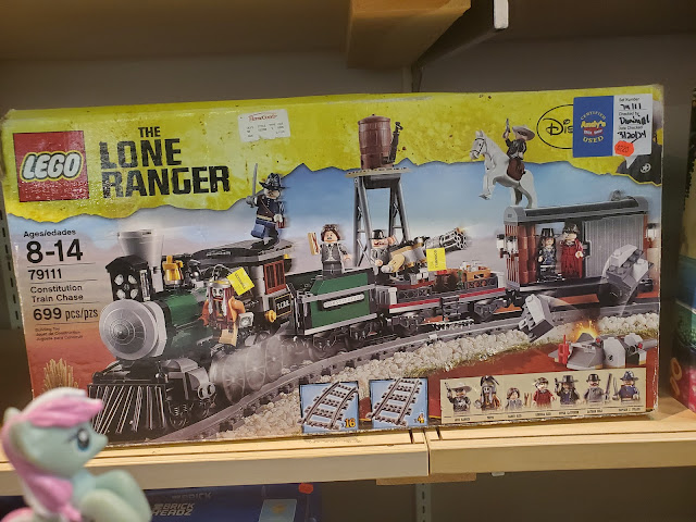 Wow, the 2nd-hand Lego Store near us Andy's Brick Shop has this old Lone Ranger set for $220. They left the other sticker on it, apparently somebody got this at a Goodwill store for $3.99. The original HomeGoods sticker is on there, too. So this train has been all over! It's a reminder that you can score good deals at the Goodwill store, at least.